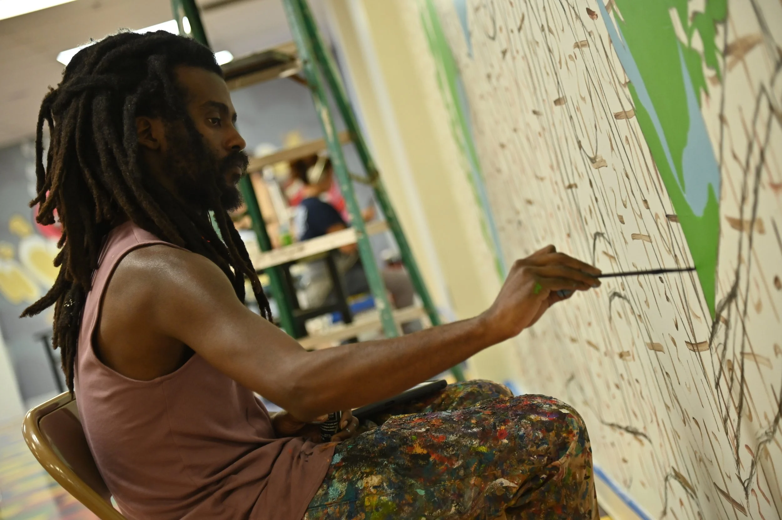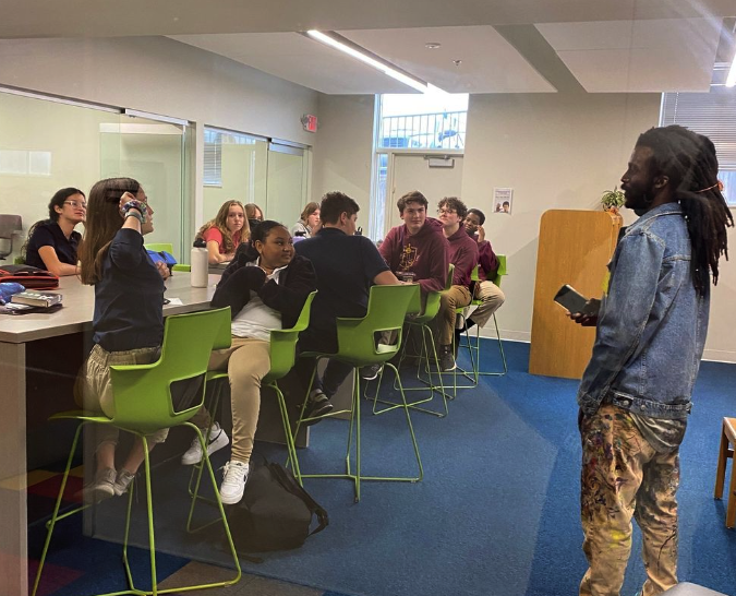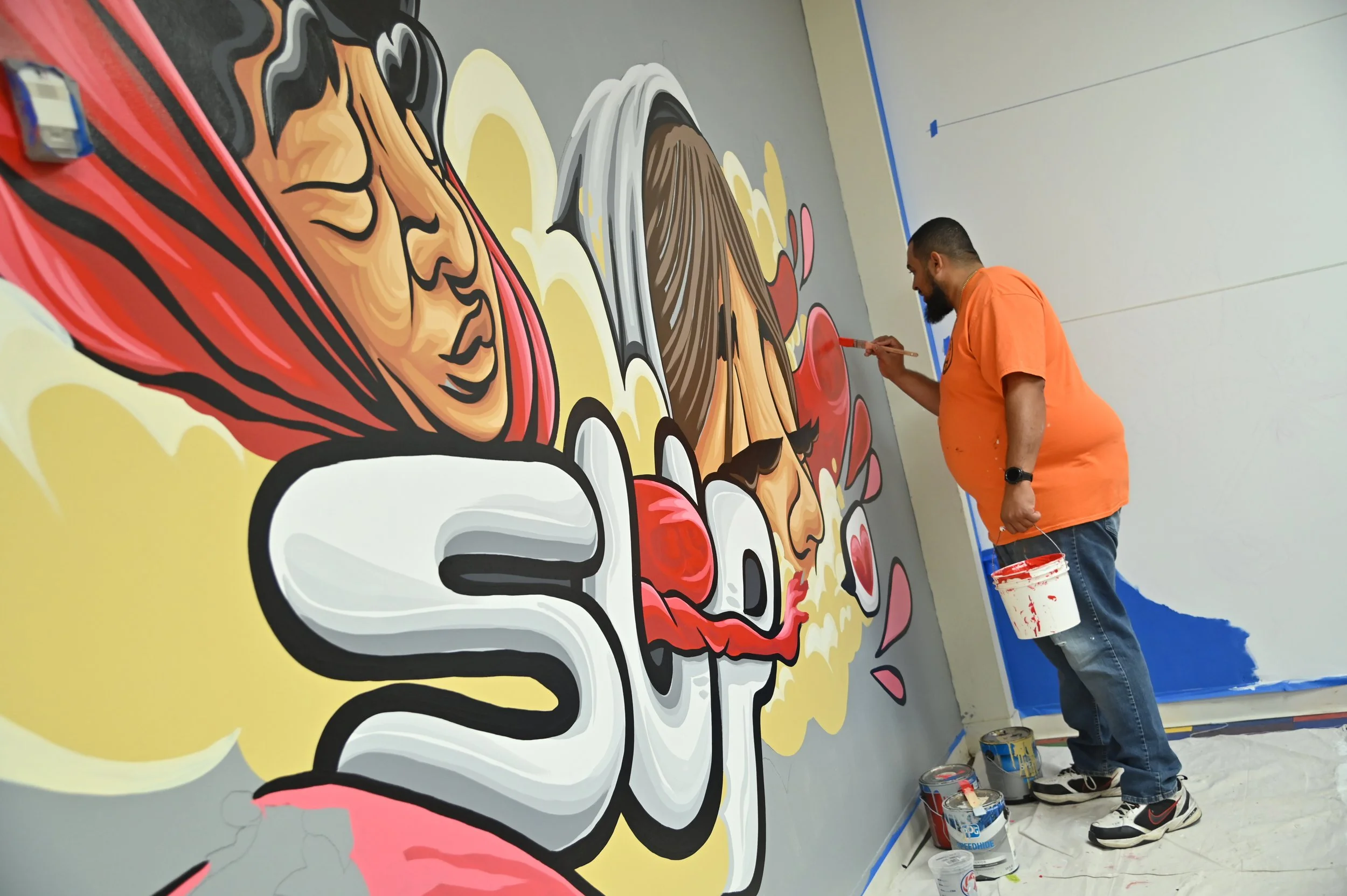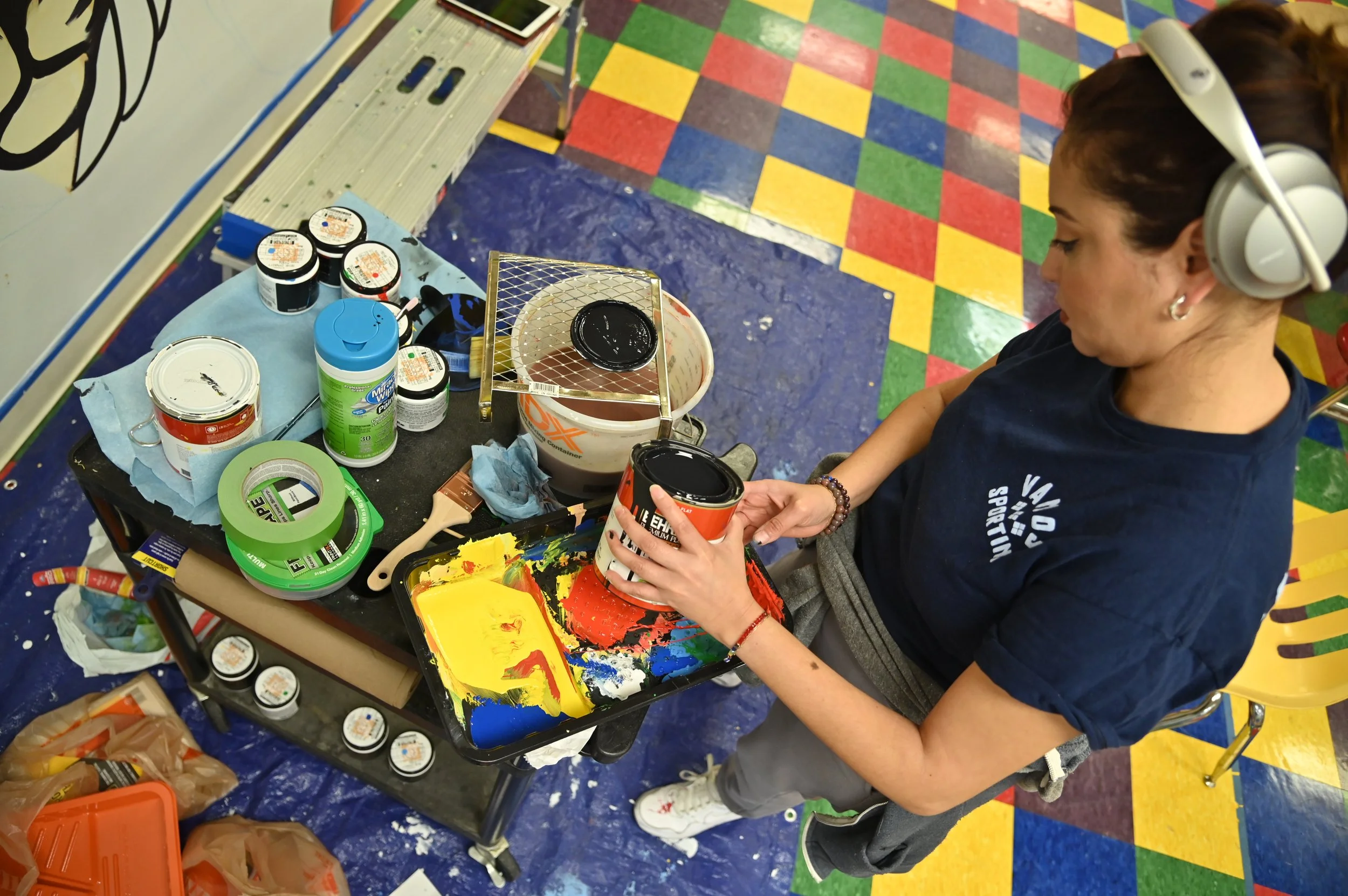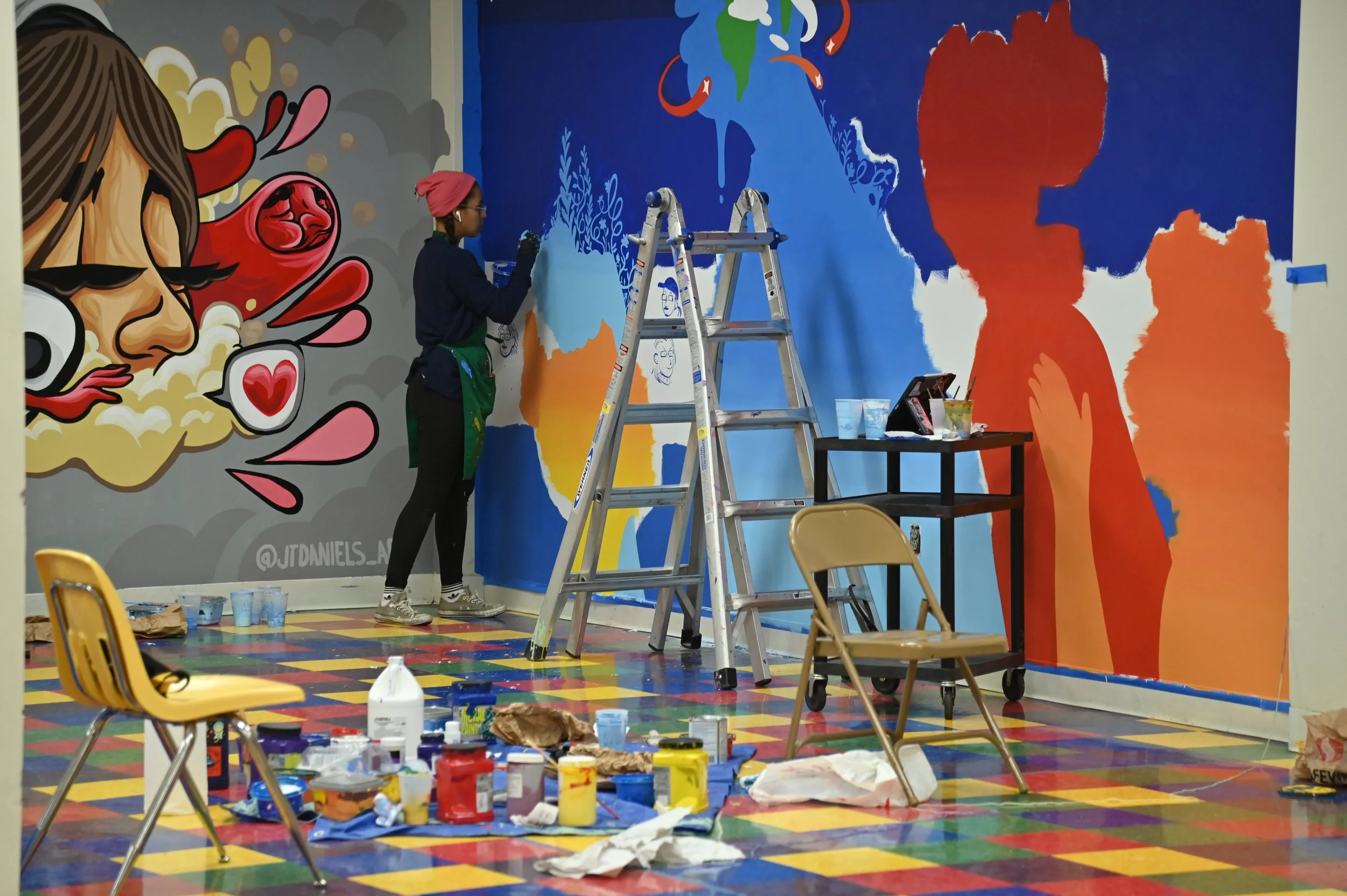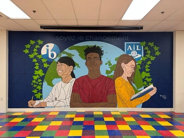 For this project, after several meetings with teaches and staff members the project was set in motion. Then we hosted an assembly and brought in four muralists to meet the students. With the help of the Art Teacher, Ms. Ramey, and other teachers, the students divided into four groups and each spent some time with an artist, and a conversation was had. “What inspires you? What do you think would best represent you on a mural? What’s important to you about your time at Académie Lafayette?” It was a great afternoon that led to four great murals that will represent these students for years in their cafeteria.